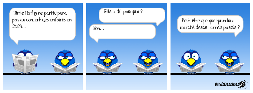 Case 1:Bird 1: Mimie Mathy ne participera pas au concert des enfoirés en 2024... | Case 2: Bird 1: Elle a dit pourquoi ? Bird 2: Non... | Case 3: Bird 1: Peut-être que quelqu'un lui a marché dessus l'année passée ?