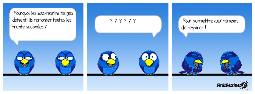 Case 1:Bird 1: Pourquoi les sous-marins belges doivent-ils remonter toutes les trente secondes ? | Case 2: Bird 1: ? ? ? ? ? ? | Case 3: Bird 1: Pour permettre aux rameurs de respirer !