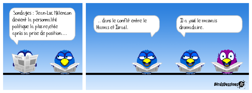 Case 1:Bird 1: Sondages : Jean-Luc Mélencon devient la personnalité politique la plus rejetée après sa prise de position.... | Case 2: Bird 1: .. dans le conflit entre le Hamas et Israël. | Case 3: Bird 1: Il a joué le mauvais dromadaire.