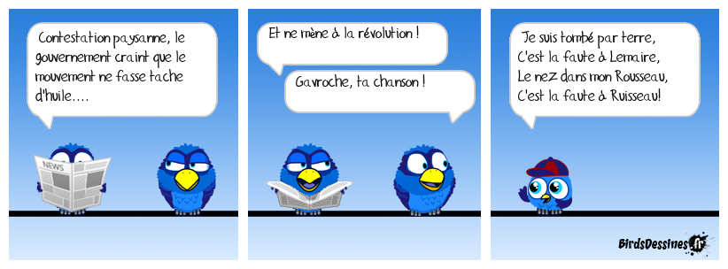 Case 1:Bird 1: Contestation paysanne, le gouvernement craint que le mouvement ne fasse tache d'huile.... | Case 2: Bird 1: Et ne mène à la révolution ! Bird 2: Gavroche, ta chanson ! | Case 3: Bird 1: Je suis tombé par terre, C'est la faute à Lemaire, Le nez dans mon Rousseau, C'est la faute à Ruisseau!