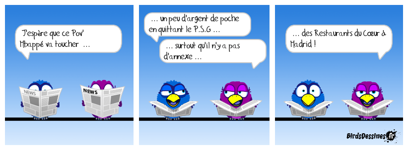 Case 1:Bird 1: J'espère que ce Pov' Mbappé va toucher ... | Case 2: Bird 1: ... un peu d'argent de poche en quittant le P.S.G ... Bird 2: ... surtout qu'il n'y a pas d'annexe ... | Case 3: Bird 1: ... des Restaurants du Cœur à Madrid !