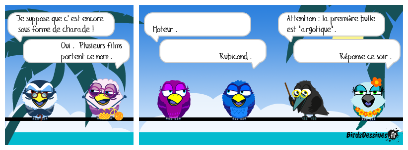 Case 1:Bird 1: Je suppose que c' est encore sous forme de charade !Bird 2: Oui . Plusieurs films portent ce nom . | Case 2: Bird 1: Moteur . Bird 2: Rubicond . | Case 3: Bird 1: Attention : la première bulle est "argotique". Bird 2: Réponse ce soir .