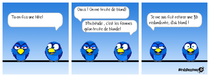 Case 1:Bird 1: Tu en fais une tête! | Case 2: Bird 1: Ouais ! On me traite de blond! Bird 2: D'habitude , c'est les femmes qu'on traite de blonde! | Case 3: Bird 1: Je me suis fait retirer une BD redondante, d'où blond !
