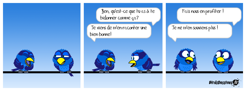 Case 1: | Case 2: Bird 1: Ben, qu'est-ce que tu as à te bidonner comme ça? Bird 2: Je viens de m'en raconter une bien bonne! | Case 3: Bird 1: Fais nous en profiter ! Bird 2: Je ne m'en souviens plus !