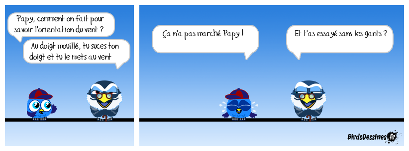 Case 1:Bird 1: Papy, comment on fait pour savoir l'orientation du vent ?Bird 2: Au doigt mouillé, tu suces ton doigt et tu le mets au vent | Case 2: Bird 1: Ça n'a pas marché Papy ! | Case 3: Bird 1: Et t'as essayé sans les gants ?