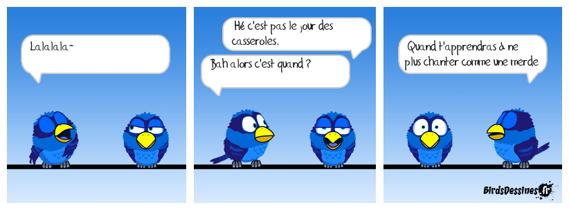Case 1:Bird 1: Lalalala~Bird 2: Ouais | Case 2: Bird 1: Hé c'est pas le jour des casseroles. Bird 2: Bah alors c'est quand ? | Case 3: Bird 1: Quand t'apprendras à ne plus chanter comme une merde Bird 2: Quand t'apprendreras à chanter