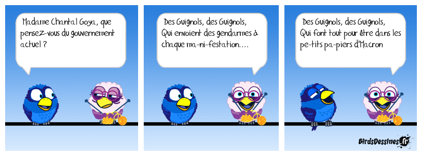Case 1:Bird 1: Madame Chantal Goya, que pensez-vous du gouvernement actuel ? | Case 2: Bird 1: Des Guignols, des Guignols, Qui envoient des gendarmes à chaque ma-ni-festation.... | Case 3: Bird 1: Des Guignols, des Guignols, Qui font tout pour être dans les pe-tits pa-piers d'Macron