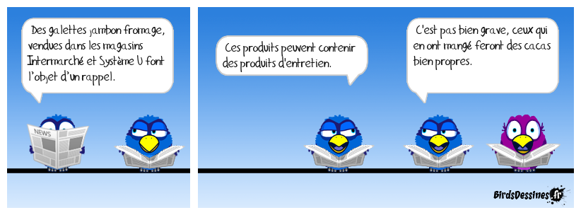 Case 1:Bird 1: Des galettes jambon fromage, vendues dans les magasins Intermarché et Système U font l’objet d’un rappel. | Case 2: Bird 1: Ces produits peuvent contenir des produits d'entretien. | Case 3: Bird 1: C'est pas bien grave, ceux qui en ont mangé feront des cacas bien propres.