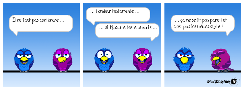 Case 1:Bird 1: Il ne faut pas confondre ... | Case 2: Bird 1: ... Monsieur testamente ... Bird 2: ... et Madame teste amants ... | Case 3: Bird 1: ... ça ne se lit pas pareil et c'est pas les mêmes stylos !