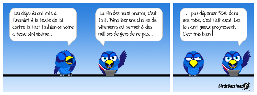 Case 1:Bird 1: Les députés ont voté à l'unanimité le texte de loi contre la fast fashion oh votre altesse sérénissime.. | Case 2: Bird 1: La fin des maxi promos, c'est fait. Pénaliser une chaine de vêtements qui permet à des millions de gens de ne pas... | Case 3: Bird 1: ... pas dépenser 50€ dans une robe, c'est fait aussi. Les lois anti gueux progressent. C'est très bien !
