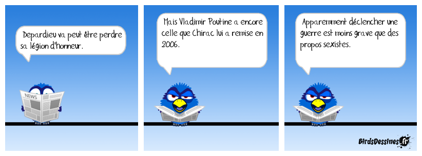 Case 1:Bird 1: Depardieu va peut être perdre sa légion d'honneur. | Case 2: Bird 1: Mais Vladimir Poutine a encore celle que Chirac lui a remise en 2006. | Case 3: Bird 1: Apparemment déclencher une guerre est moins grave que des propos sexistes.