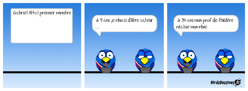 Case 1:Bird 1: Gabriel Attal premier ministre | Case 2: Bird 1: à 9 ans je rêvais d'être acteur ... | Case 3: Bird 1: à 34 ans mon prof de théâtre réalise mon rêve.