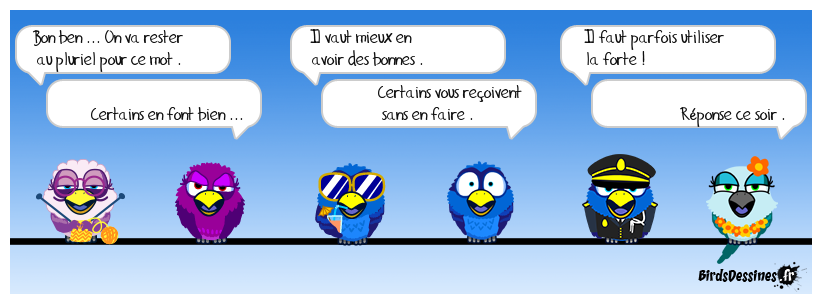 Case 1:Bird 1: Bon ben ... On va rester au pluriel pour ce mot .Bird 2: Certains en font bien ... | Case 2: Bird 1: Il vaut mieux en avoir des bonnes . Bird 2: Certains vous reçoivent sans en faire . | Case 3: Bird 1: Il faut parfois utiliser la forte ! Bird 2: Réponse ce soir .