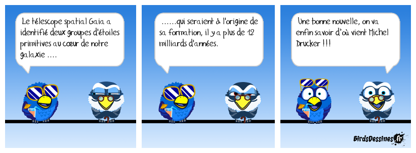 Case 1:Bird 1: Le télescope spatial Gaia a identifié deux groupes d'étoiles primitives au cœur de notre galaxie .... | Case 2: Bird 1: ......qui seraient à l'origine de sa formation, il y a plus de 12 milliards d'années. | Case 3: Bird 1: Une bonne nouvelle, on va enfin savoir d’où vient Michel Drucker !!!
