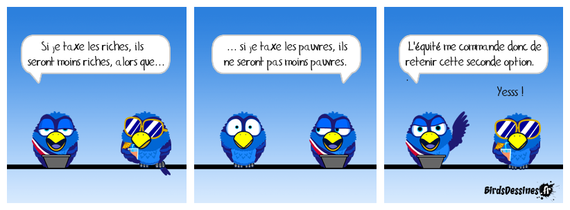 Case 1:Bird 1: Si je taxe les riches, ils seront moins riches, alors que... | Case 2: Bird 1: ... si je taxe les pauvres, ils ne seront pas moins pauvres. | Case 3: Bird 1: L'équité me commande donc de retenir cette seconde option. . Yesss !