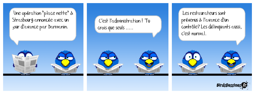Case 1:Bird 1: Une opération "place nette" à Strasbourg annoncée avec un jour d'avance par Darmanin. | Case 2: Bird 1: C'est l'administration ! Tu crois que seuls ..... | Case 3: Bird 1: Les restaurateurs sont prévenus à l'avance d'un contrôle? Les délinquants aussi, c'est normal.