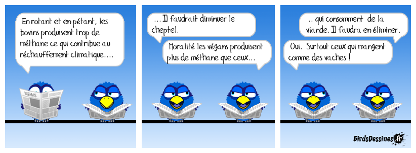 Case 1:Bird 1: En rotant et en pétant, les bovins produisent trop de méthane ce qui contribue au réchauffement climatique.... | Case 2: Bird 1: ... Il faudrait diminuer le cheptel. Bird 2: Moralité les végans produisent plus de méthane que ceux... | Case 3: Bird 1: .. qui consomment de la viande. Il faudra en éliminer. Bird 2: Oui. Surtout ceux qui mangent comme des vaches !
