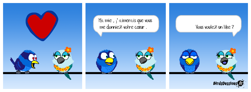 Case 1: | Case 2: Bird 1: Ma mie , j' aimerais que vous me donniez votre cœur . | Case 3: Bird 1: Vous voulez un like ?
