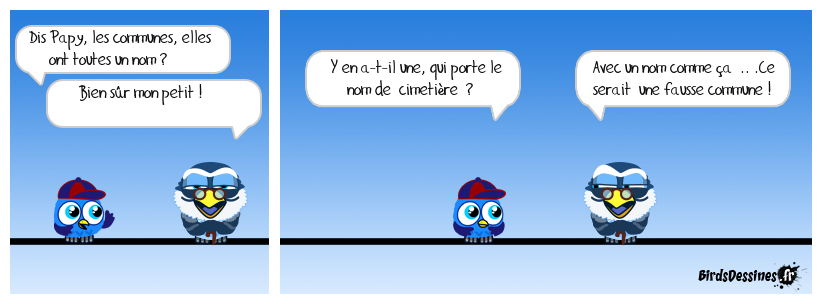 Case 1:Bird 1: Dis Papy, les communes, elles ont toutes un nom ?Bird 2: Bien sûr mon petit ! | Case 2: Bird 1: Y en a-t-il une, qui porte le nom de cimetière ? | Case 3: Bird 1: Avec un nom comme ça .. .Ce serait une fausse commune !