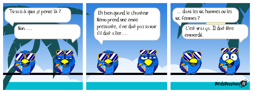 Case 1:Bird 1: Tu sais à quoi je pense là ? Bird 2: Non..... | Case 2: Bird 1: Eh bien quand le chanteur Nemo prend une envie pressante, il ne doit pas savoir s'il doit aller.... | Case 3: Bird 1: ... dans les wc hommes ou les wc femmes ? Bird 2: C'est vrai ça. Il doit être emmerdé.