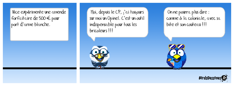 Case 1:Bird 1: Nice expérimente une amende forfaitaire de 500 € pour port d’arme blanche. | Case 2: Bird 1: Moi, depuis le CP, j’ai toujours sur moi un Opinel. C’est un outil indispensable pour tous les bricoleurs !!! | Case 3: Bird 1: On ne pourra plus dire : comme à la coloniale, avec sa bite et son couteau !!!
