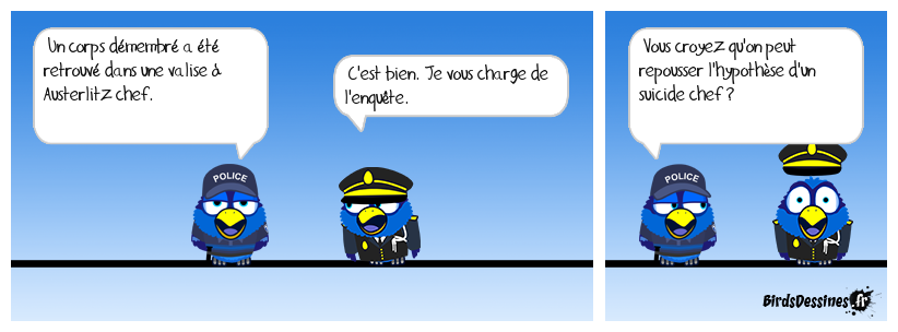 Case 1:Bird 1: Un corps démembré a été retrouvé dans une valise à Austerlitz chef. | Case 2: Bird 1: C'est bien. Je vous charge de l'enquête. | Case 3: Bird 1: Vous croyez qu'on peut repousser l'hypothèse d'un suicide chef ?