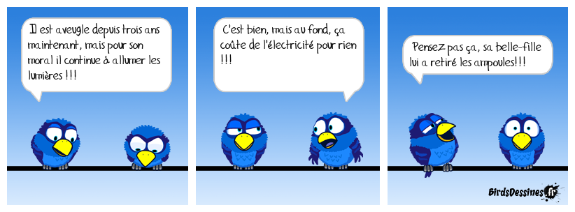 Case 1:Bird 1: Il est aveugle depuis trois ans maintenant, mais pour son moral il continue à allumer les lumières !!! | Case 2: Bird 1: C'est bien, mais au fond, ça coûte de l'électricité pour rien !!! | Case 3: Bird 1: Pensez pas ça, sa belle-fille lui a retiré les ampoules!!!