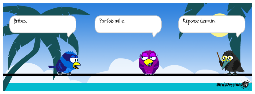 Case 1:Bird 1: Bribes. | Case 2: Bird 1: Parfois mille. | Case 3: Bird 1: Réponse demain.