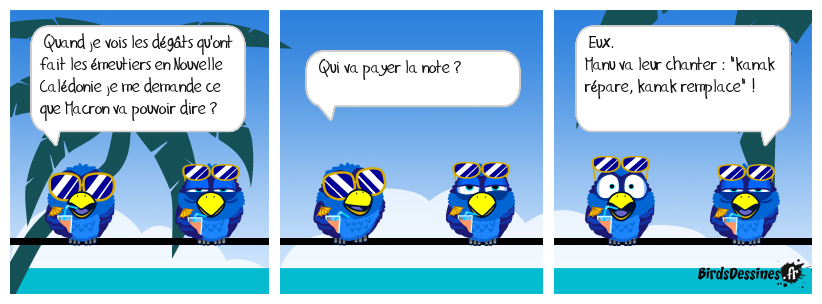 Case 1:Bird 1: Quand je vois les dégâts qu'ont fait les émeutiers en Nouvelle Calédonie je me demande ce que Macron va pouvoir dire ? | Case 2: Bird 1: Qui va payer la note ? | Case 3: Bird 1: Eux. Manu va leur chanter : "kanak répare, kanak remplace" !