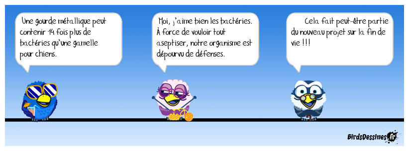 Case 1:Bird 1: Une gourde métallique peut contenir 14 fois plus de bactéries qu’une gamelle pour chiens. | Case 2: Bird 1: Moi, j’aime bien les bactéries. À force de vouloir tout aseptiser, notre organisme est dépourvu de défenses. | Case 3: Bird 1: Cela fait peut-être partie du nouveau projet sur la fin de vie !!!