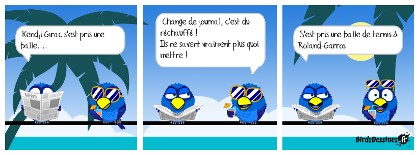Case 1:Bird 1: Kendji Girac s'est pris une balle.... | Case 2: Bird 1: Change de journal, c'est du réchauffé ! Ils ne savent vraiment plus quoi mettre ! | Case 3: Bird 1: S'est pris une balle de tennis à Roland-Garros