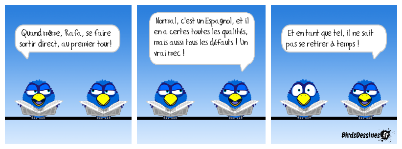 Case 1:Bird 1: Quand même, Rafa, se faire sortir direct, au premier tour! | Case 2: Bird 1: Normal, c'est un Espagnol, et il en a certes toutes les qualités, mais aussi tous les défauts ! Un vrai mec ! | Case 3: Bird 1: Et en tant que tel, il ne sait pas se retirer à temps !