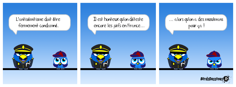 Case 1:Bird 1: L'antisémitisme doit être fermement condamné. | Case 2: Bird 1: Il est honteux qu'on déteste encore les juifs en France... | Case 3: Bird 1: ... alors qu'on a des musulmans pour ça !