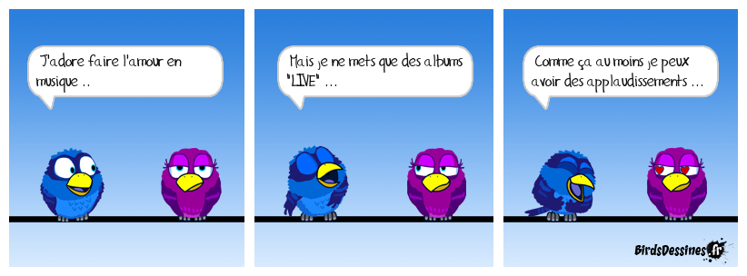 Case 1:Bird 1: J'adore faire l'amour en musique .. | Case 2: Bird 1: Mais je ne mets que des albums "LIVE" ... | Case 3: Bird 1: Comme ça au moins je peux avoir des applaudissements ...