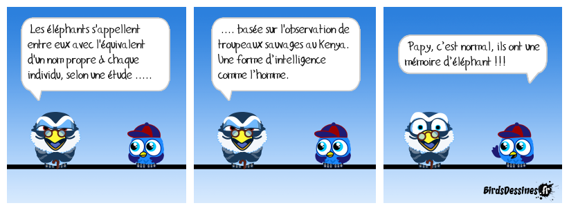 Case 1:Bird 1: Les éléphants s'appellent entre eux avec l'équivalent d'un nom propre à chaque individu, selon une étude ..... | Case 2: Bird 1: .... basée sur l'observation de troupeaux sauvages au Kenya. Une forme d’intelligence comme l’homme. | Case 3: Bird 1: Papy, c’est normal, ils ont une mémoire d’éléphant !!!