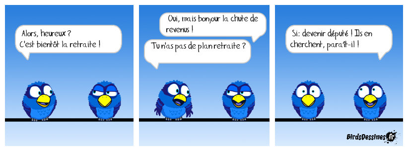 Case 1:Bird 1: Alors, heureux ? C'est bientôt la retraite ! | Case 2: Bird 1: Oui, mais bonjour la chute de revenus ! Bird 2: Tu n'as pas de plan retraite ? | Case 3: Bird 1: Si: devenir député ! Ils en cherchent, paraït-il !