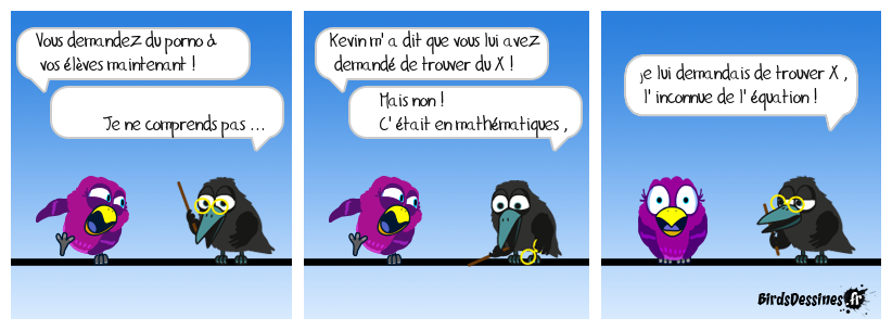 Case 1:Bird 1: Vous demandez du porno à vos élèves maintenant !Bird 2: Je ne comprends pas ... | Case 2: Bird 1: Kevin m' a dit que vous lui avez demandé de trouver du X ! Bird 2: Mais non ! C' était en mathématiques , | Case 3: Bird 1: je lui demandais de trouver X , l' inconnue de l' équation !