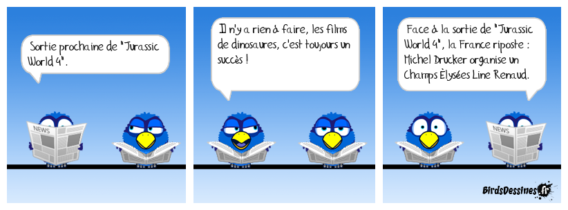 Case 1:Bird 1: Sortie prochaine de "Jurassic World 4". | Case 2: Bird 1: Il n'y a rien à faire, les films de dinosaures, c'est toujours un succès ! | Case 3: Bird 1: Face à la sortie de "Jurassic World 4", la France riposte : Michel Drucker organise un Champs Élysées Line Renaud.