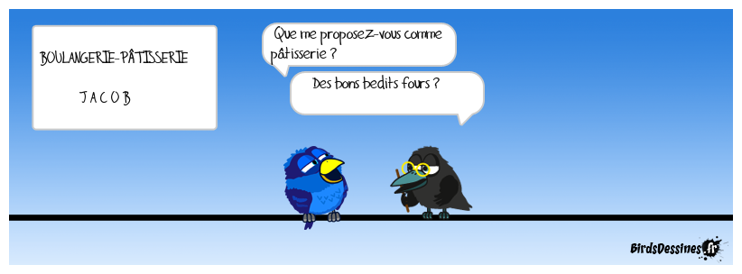 Case 1:Bird 1: BOULANGERIE-PÂTISSERIE J A C O B | Case 2: Bird 1: Que me proposez-vous comme pâtisserie ? Bird 2: Des bons bedits fours ? | Case 3: