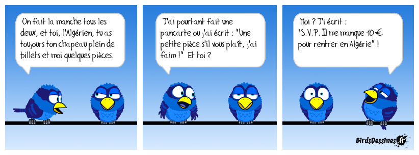 Case 1:Bird 1: On fait la manche tous les deux, et toi, l'Algérien, tu as toujours ton chapeau plein de billets et moi quelques pièces. | Case 2: Bird 1: J'ai pourtant fait une pancarte ou j'ai écrit : "Une petite pièce s'il vous plaït, j'ai faim !" Et toi ? | Case 3: Bird 1: Moi ? J'i écrit : "S.V.P. Il me manque 10 € pour rentrer en Algérie" !