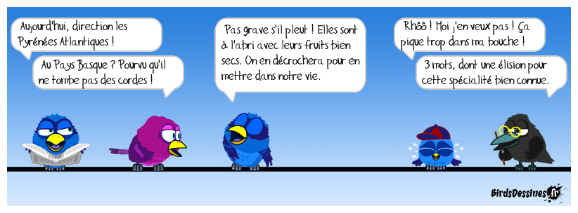Case 1:Bird 1: Aujourd'hui, direction les Pyrénées Atlantiques !Bird 2: Au Pays Basque ? Pourvu qu'il ne tombe pas des cordes ! | Case 2: Bird 1: Pas grave s'il pleut ! Elles sont à l'abri avec leurs fruits bien secs. On en décrochera pour en mettre dans notre vie. Bird 2: | Case 3: Bird 1: Rhôô ! Moi j'en veux pas ! Ça pique trop dans ma bouche ! Bird 2: 3 mots, dont une élision pour cette spécialité bien connue.