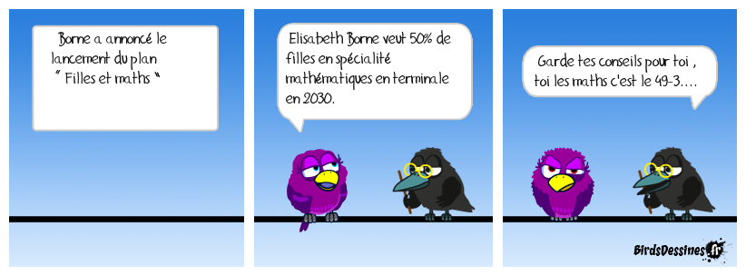Case 1:Bird 1: Borne a annoncé le lancement du plan « Filles et maths » | Case 2: Bird 1: Elisabeth Borne veut 50% de filles en spécialité mathématiques en terminale en 2030. | Case 3: Bird 1: Garde tes conseils pour toi , toi les maths c'est le 49-3....