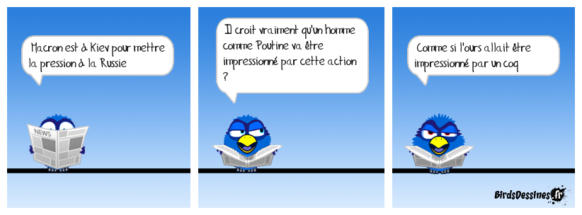 Case 1:Bird 1: Macron est à Kiev pour mettre la pression à la Russie | Case 2: Bird 1: Il croit vraiment qu'un homme comme Poutine va être impressionné par cette action ? | Case 3: Bird 1: Comme si l'ours allait être impressionné par un coq