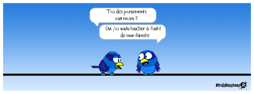 Case 1: | Case 2: Bird 1: T'as des pansements aux mains ? Bird 2: Oui j'ai voulu toucher à l'outil de mon fumiste | Case 3: