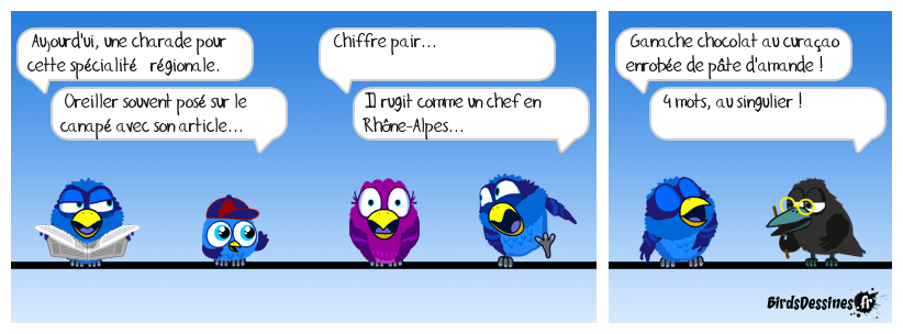 Case 1:Bird 1: Aujourd'ui, une charade pour cette spécialité régionale.Bird 2: Oreiller souvent posé sur le canapé avec son article... | Case 2: Bird 1: Chiffre pair... Bird 2: Il rugit comme un chef en Rhône-Alpes... | Case 3: Bird 1: Ganache chocolat au curaçao enrobée de pâte d'amande ! Bird 2: 4 mots, au singulier !