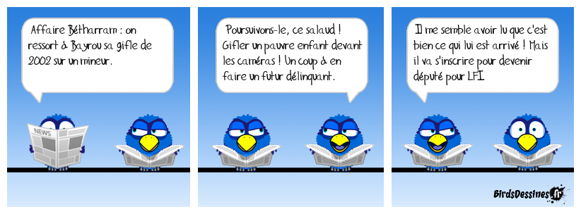 Case 1:Bird 1: Affaire Bétharram : on ressort à Bayrou sa gifle de 2002 sur un mineur. | Case 2: Bird 1: Poursuivons-le, ce salaud ! Gifler un pauvre enfant devant les caméras ! Un coup à en faire un futur délinquant. | Case 3: Bird 1: Il me semble avoir lu que c'est bien ce qui lui est arrivé ! Mais il va s'inscrire pour devenir député pour LFI.