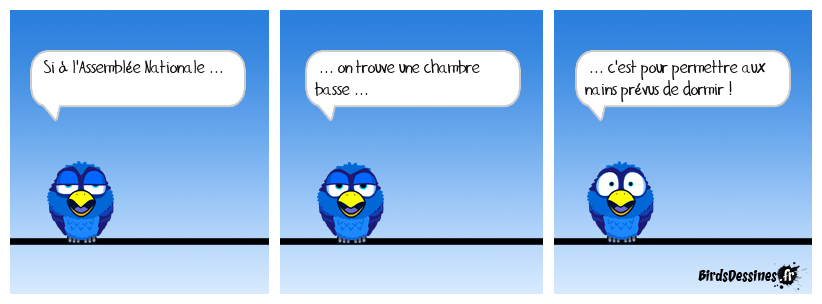 Case 1:Bird 1: Si à l'Assemblée Nationale ... | Case 2: Bird 1: ... on trouve une chambre basse ... | Case 3: Bird 1: ... c'est pour permettre aux nains prévus de dormir !