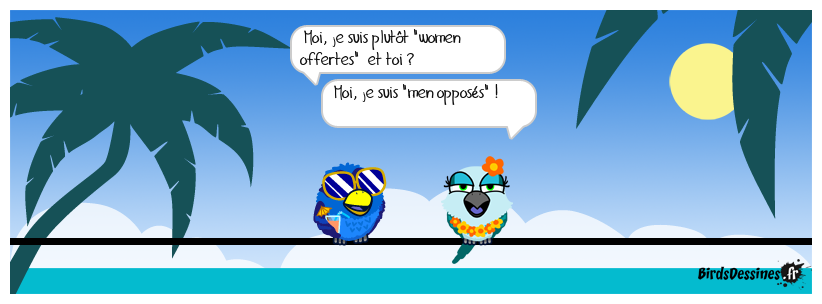Case 1: | Case 2: Bird 1: Moi, je suis plutôt "women offertes" et toi ? Bird 2: Moi, je suis "men opposés" ! | Case 3: