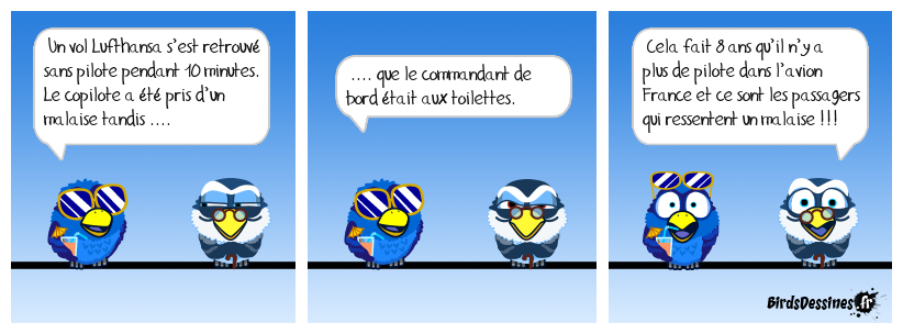 Case 1:Bird 1: Un vol Lufthansa s’est retrouvé sans pilote pendant 10 minutes. Le copilote a été pris d’un malaise tandis .... | Case 2: Bird 1: .... que le commandant de bord était aux toilettes. | Case 3: Bird 1: Cela fait 8 ans qu’il n’y a plus de pilote dans l’avion France et ce sont les passagers qui ressentent un malaise !!!