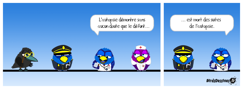 Case 1: | Case 2: Bird 1: L'autopsie démontre sans aucun doute que le défunt... | Case 3: Bird 1: ... est mort des suites de l'autopsie.